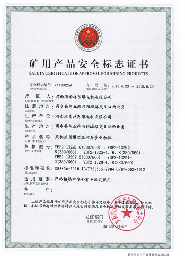 YBF2風(fēng)機(jī)用防爆電機(jī)煤安證