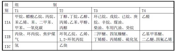 II 類 除煤礦外的其他爆炸性氣體環境用電氣設備。II 類爆炸性氣體的特性進一步分類為:IIA、IIB、IIC。II 類常見可燃性氣體、蒸氣、溫度組別見下表 II 類 用于除煤礦以外的爆炸性粉塵環境,III 類再分類:IIIA 類:可燃性飛絮 ; IIIB類:非導電性粉塵;IIIC 類:導電性粉塵;