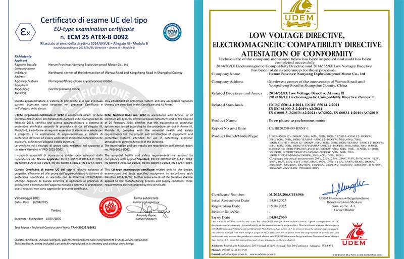 近日,河南省南洋防爆電機有限公司傳來喜訊:公司自主研發(fā)生產(chǎn)的防爆電機產(chǎn)品,順利通過權(quán)威機構(gòu)的嚴(yán)格檢測與審核,正式獲得CE認證證書與ECM 25 ATEX-B D092證書。這兩項國際權(quán)威認證的取得,不僅標(biāo)志著南洋防爆電機的產(chǎn)品質(zhì)量、安全性能達到了國際標(biāo)準(zhǔn),也為企業(yè)進一步拓展海外市場奠定了堅實基礎(chǔ)。